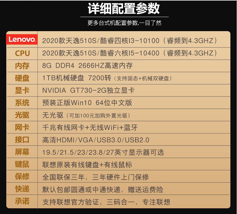 聯想臺式機電腦天逸510S/510PRO 十代六核I5-10400/四核I3 家用辦公商用財務炒股網課游戲設計全整套迷你主機